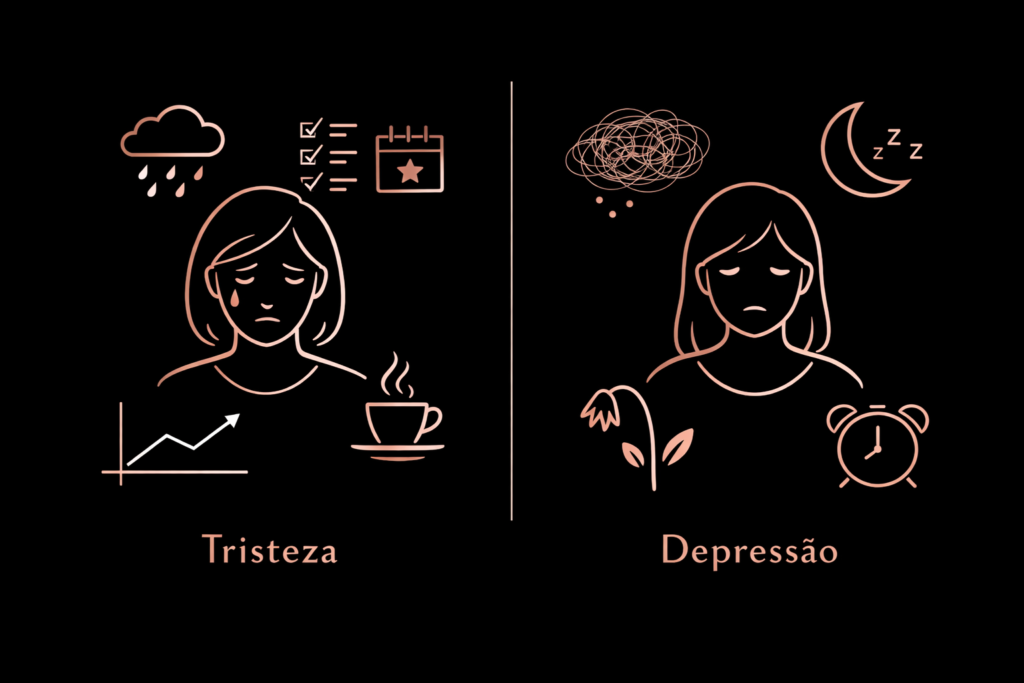 A tristeza é temporária e proporcional ao evento que a causou. Depressão é persistente (mais de duas semanas), não precisa de motivo aparente e afeta sua capacidade de funcionar. Se tem dúvida, procure avaliação profissional.